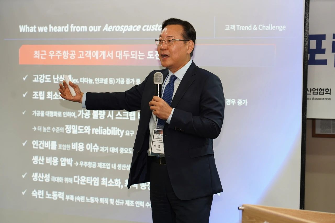 全球先进、韩国国内排名第一的机床企业DN Solutions迪恩机床代表理事金源钟25日向韩国航空航天产业界领导人强调,精密加工技术是航空航天制造革新的核心。 当天上午,金源钟代表理事作为在首尔中区韩国新闻中心举行的第13届航空航天领袖早间论坛的特别演讲者,提出了旨在加强航空航天产业制造竞争力的最新技术趋势和战略方向。