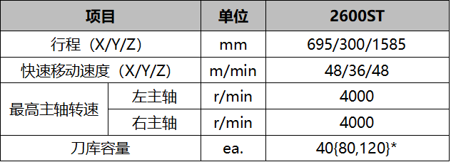左主轴、右主轴、B轴、铣削轴和下刀塔具备复合加工能力 采用有限元分析设计,保证结构具有高刚性 通过机床的正交设计结构,扩大Y轴加工范围 通过联动加工,提高生产率 2、 具有良好的控制能力和高精密度。 通过使用油冷却系统,降低主轴和进给轴的热变形 采用高刚性、高精度的滚柱式线性导轨 配备0.0001°B轴和C轴精度控制功能 3、 通过人体工学设计,让操作变得轻松、便捷。 具备前置式刀库 高度可调且配备可左右移动的回转式操作面板 配备便捷的ATC-刀库操作面板 机床规格 ——PUMA SMX 2600ST
