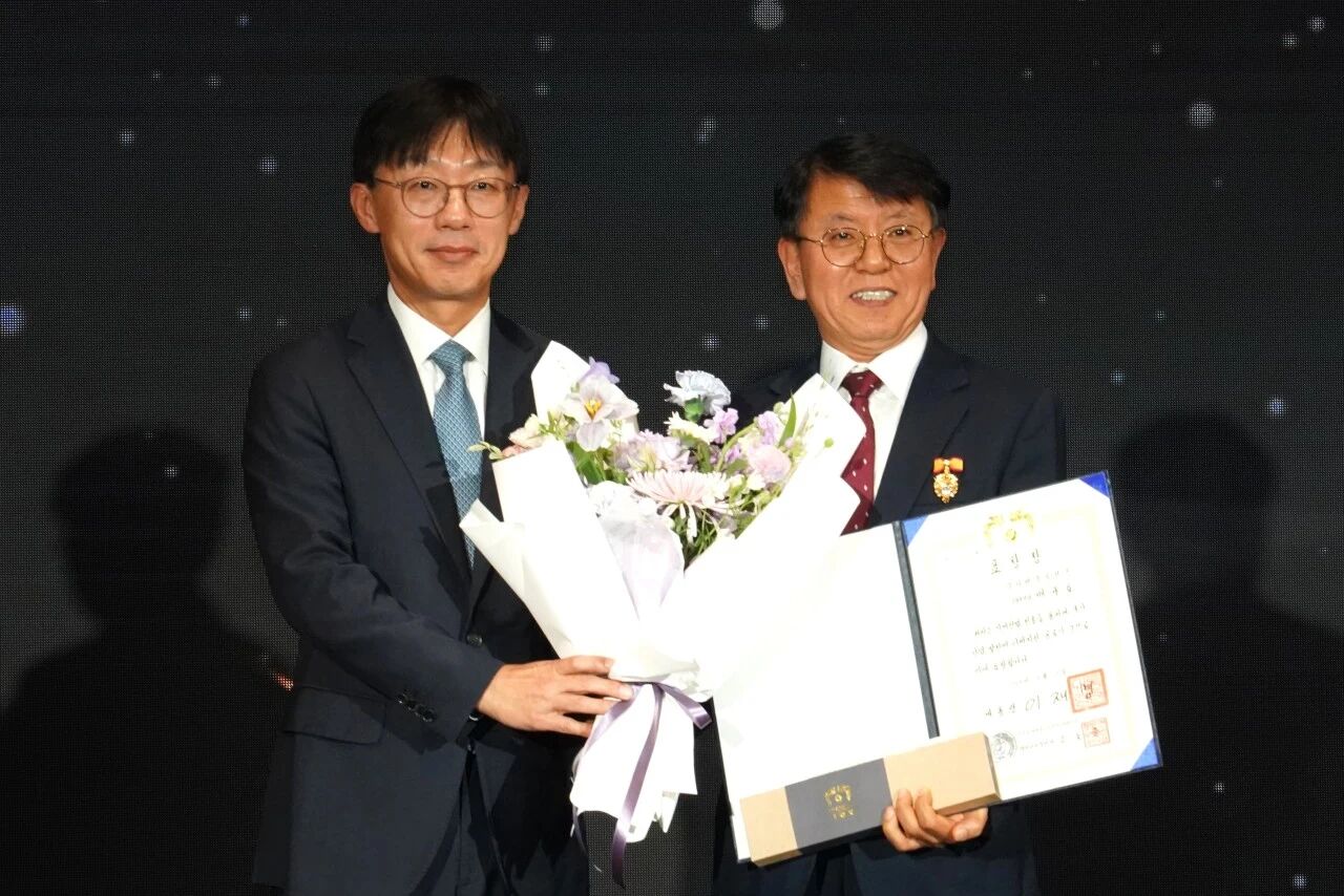 ▲照片说明:11日在汝矣岛康拉德酒店举行的"第25届机床工人日"活动中,迪恩机床首席副社长裵圭浩(右)获得韩国总统表彰并合影留念。